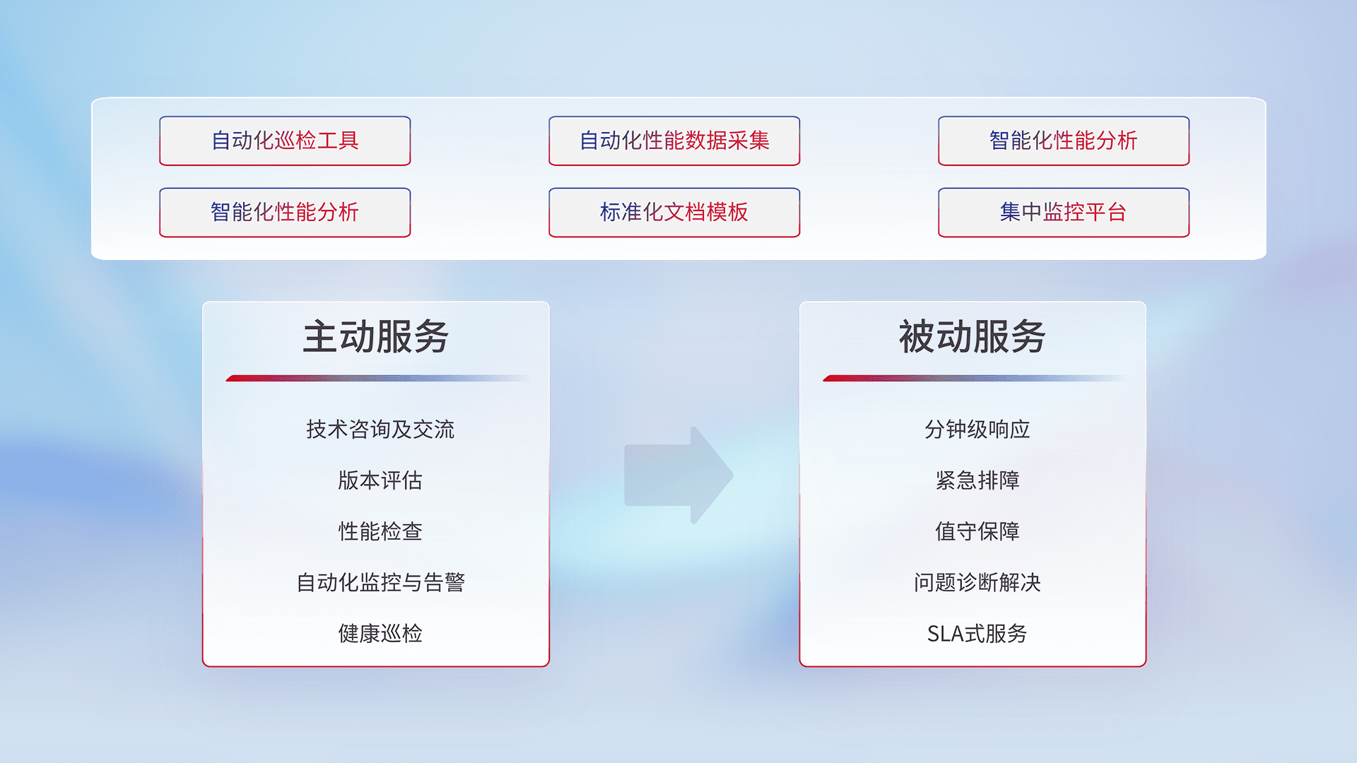 智能化工具和标准化文档,,保障服务质量,,,,提供主动服务(包含技术咨询、、、版本评估、、、、性能检查、、自动化监控与告警、、健康巡检)和被动服务包含(分钟级响应、、紧急排障、、、、值守保障、、、、问题诊断解决、、、SLA服务)。。。。